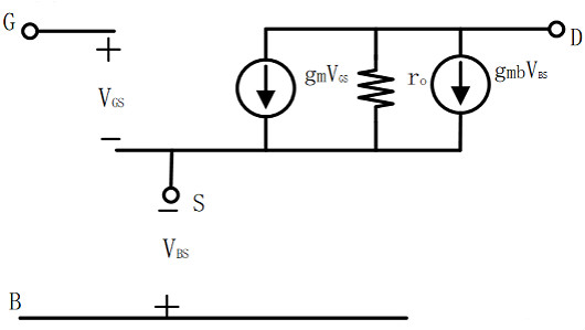 3. 考慮襯底偏置效應(體效應) 前面我們提到,MOSFET是一個四端器件,通常將襯底和源極相連作為三端器件使用,但是考慮體效應時,$V_{BS}$會對漏電流產生影響,廣義上來看,襯底起到了MOSFET另一個柵的作用,類似的用一個壓控電流源對其產生的影響進行模擬,其等效模型如下圖:
